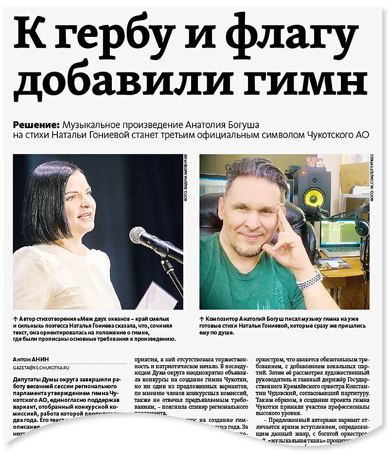 – Гимн написался очень быстро – в течение одного-двух дней всё уже было готово. Когда я прочитал стихи к гимну, меня это тут же вдохновило на работу. Сразу же пришла мелодия, и я начал писать аранжировку. Представились оркестровые инструменты, тем более что при обучении в консерватории я специализировался именно по струнно-смычковым и оркестровым инструментам. Знаю, что такое гимн, что в нём должен присутствовать остинатный ритм (многократное повторение ритмической фигуры. – Прим. «КС»), поэтому работать было легко, – сообщил Анатолий Богуш. – Насколько я знаю, изначально версию аранжировки должен был вокально наполнить хор Турецкого. Но детская версия гимна – тоже очень хорошо и интересно. Просто мне кажется, что она подходит для определённых случаев, трудно представить гимн в исполнении детей, к примеру, на взрослых спортивных соревнованиях. Всё-таки официальный гимн Чукотки, я считаю, должен быть реализован голосами взрослых вокалистов и вокалисток.