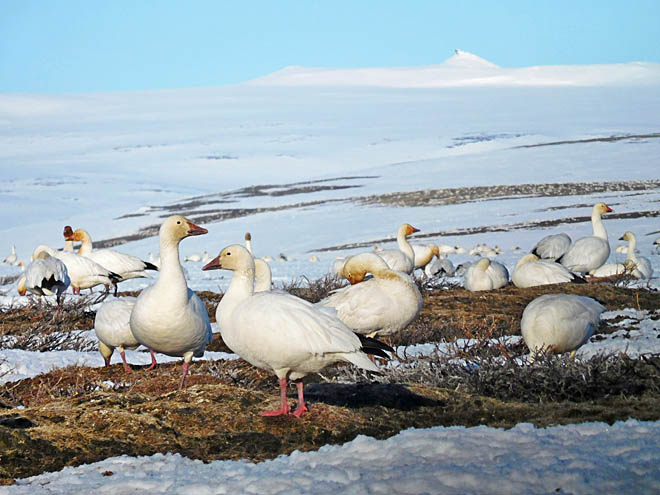 В результате гуси прилетели и обнаружили, что привычных угодий нет. Равнинная межгорная котловина, где в обычный год птицы образуют плотные гнездовые скопления, была скрыта под снегом. Оставались лишь крутые склоны и каменистые вершины сопок – места неудобные, тесные, не рассчитанные на то, чтобы принять армию из сотен тысяч птиц.
